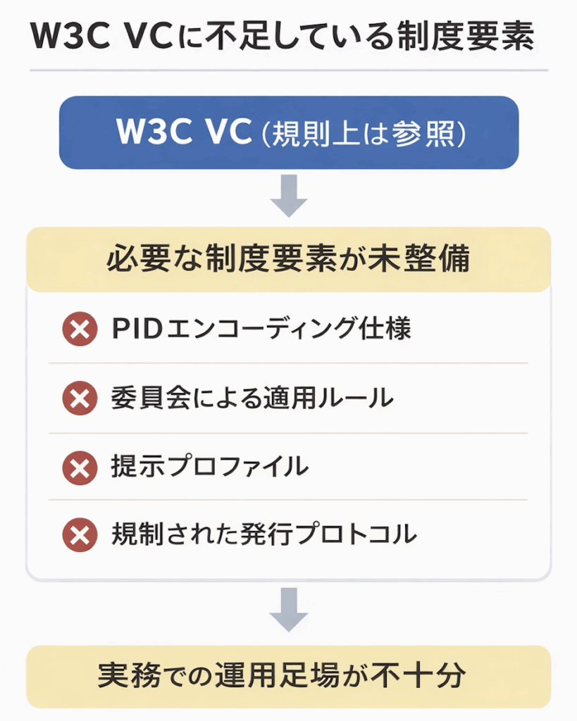 W3C VC(Verifiable Credentials)は規則案で参照されているものの、実務上機能するための運用設計が整備されていないというものです。